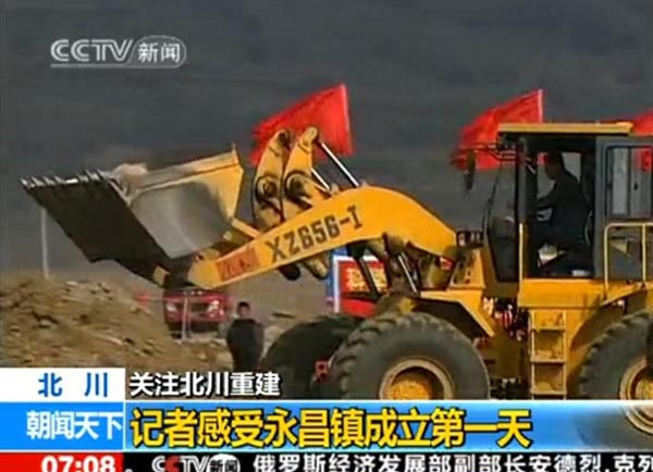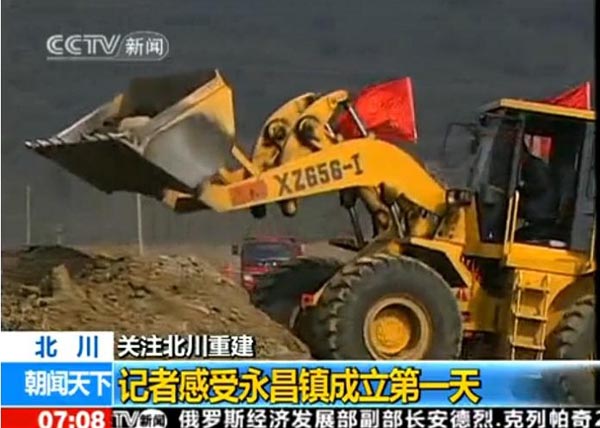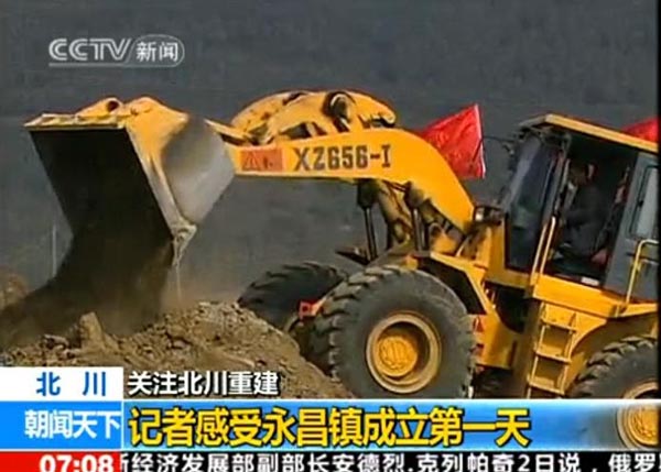 2010年2月3日早7:08分,央視新聞頻道的朝聞天下欄目,播出了汶川地震后第一個異地重建的新縣城---北川縣城所在地永昌鎮(zhèn)黨委、政府正式掛牌成立的報道,目前,北川的各項工程建設(shè)正在如火如荼的進(jìn)行中,其中在央視的報道中,廈裝XZ656-Ⅰ裝載機正在繁忙的作業(yè)中。據(jù)了解,我司的裝載機在汶川地震后的重建中發(fā)揮了重要作用。